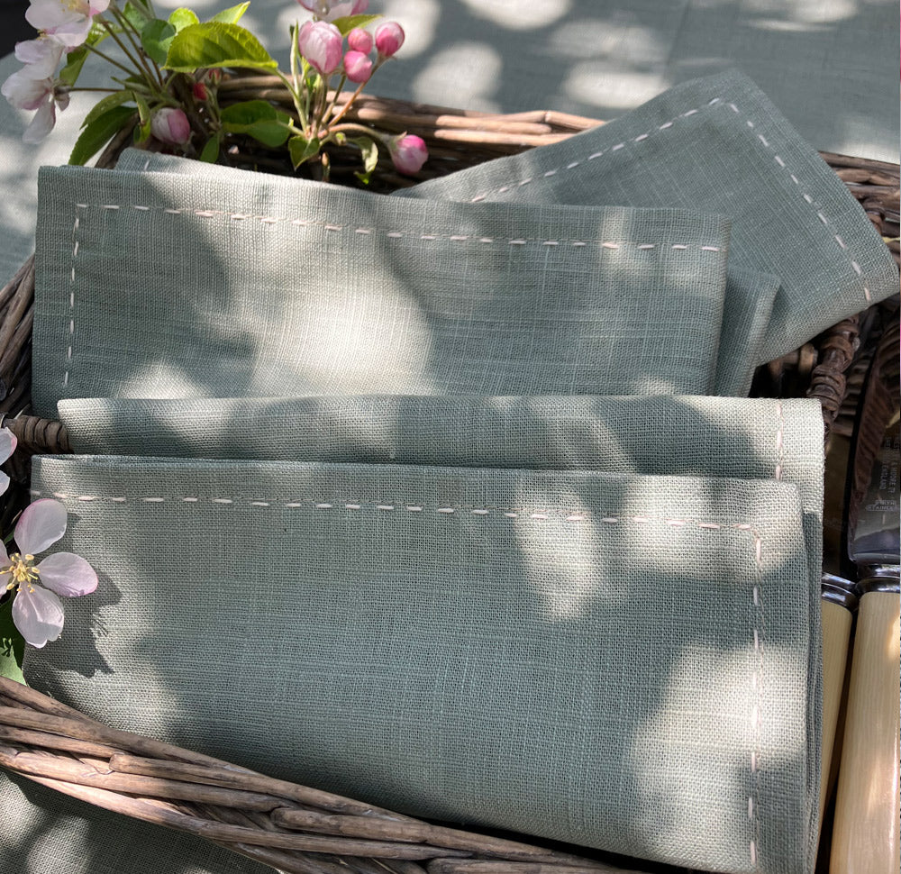 A set of two beautifully slow stitched pale sage natural fabric napkins, a sustainable alternative to paper napkins and will add an individual look to your table.