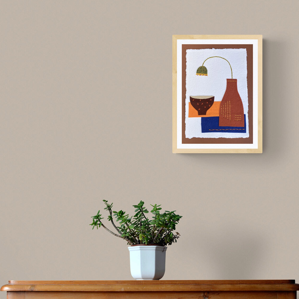 An individual textile picture comprising of a bottle with a single stem flower and patterned bowl.