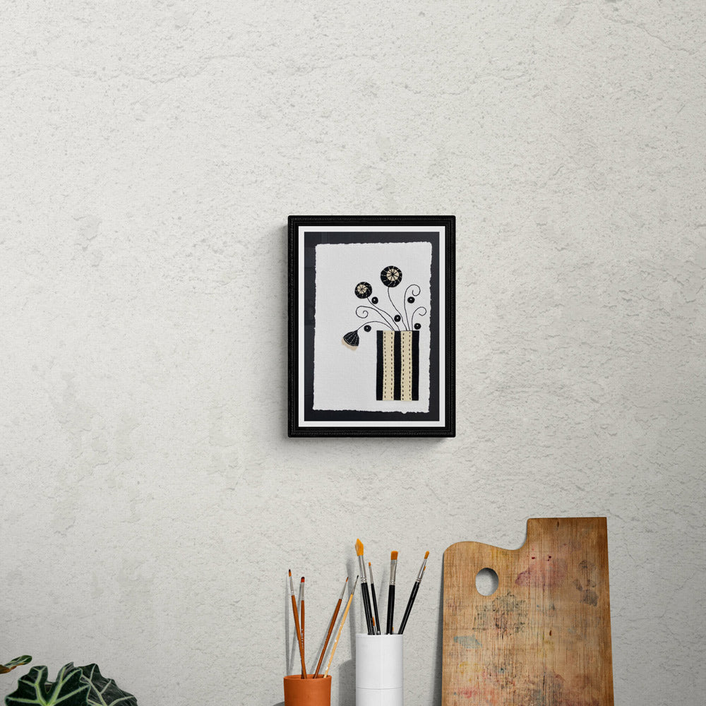 This "one-off" textile work has been placed onto antique white handmade cotton rag paper and is embellished with hand stitched threads, it is mounted on complementary black card.