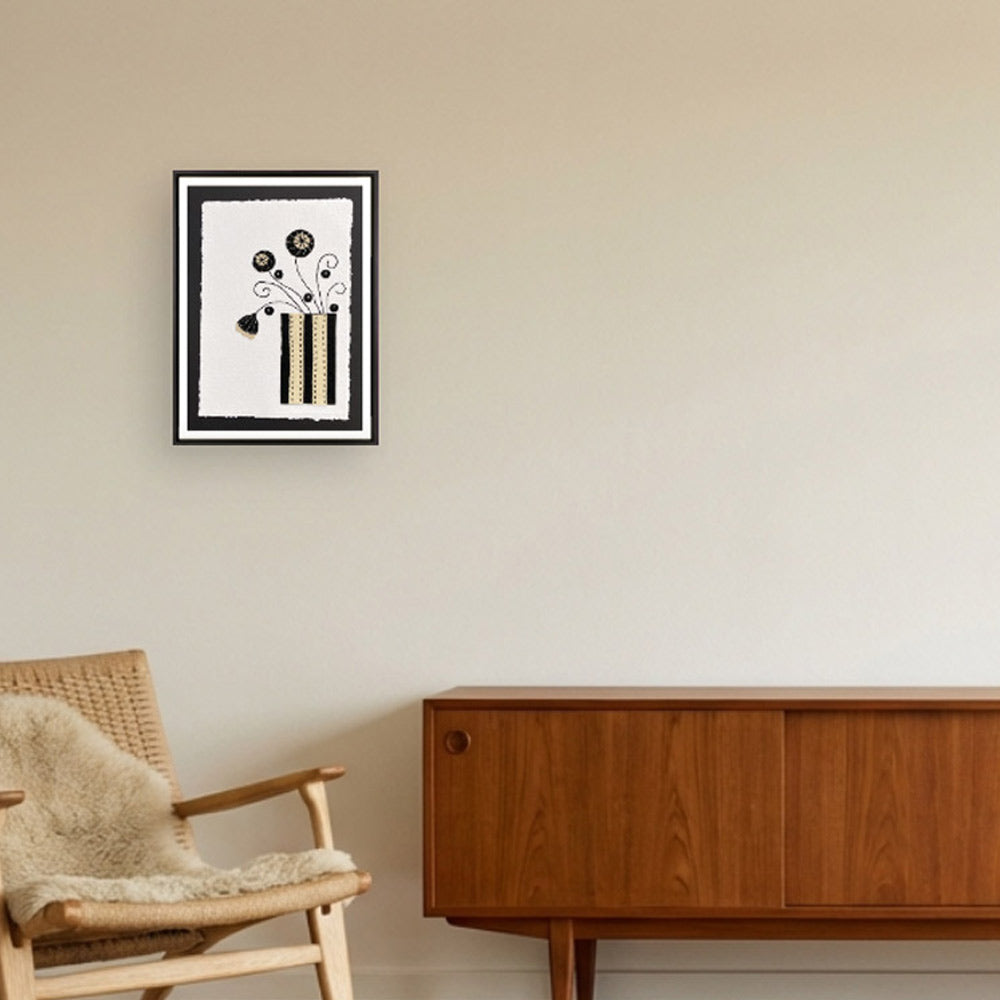 An individual textile picture comprising of a contemporary stripe vase with dried poppy heads.